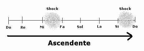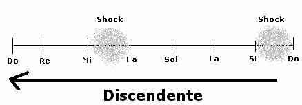 Gli shock dell’ottava ascendente devono essere di una forza tale che permetta al tono di rimanere in linea retta. Quindi nel primo intervallo tale tono deve avere una certa forza, nel secondo intervallo, invece, deve essere applicata una forza maggiore della prima in quanto il secondo DO è di una vibrazione più alta del FA e necessita di una vibrazione di tono più alto. Nell’ottava discendente i punti, invece, sono fra il DO-SI ed il FA-MI:
